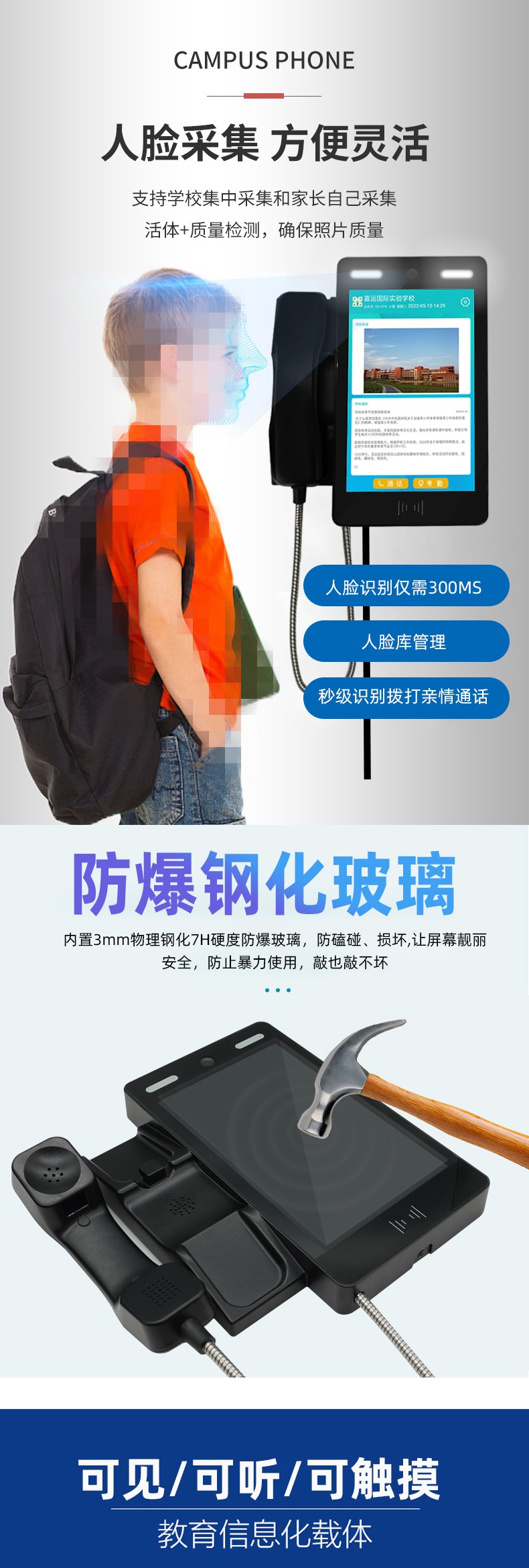 人臉識別可視話機(jī)產(chǎn)品穩(wěn)定,使用方便??梢酝ㄟ^人臉識別,撥打親子電話,學(xué)生可以選擇語音或視頻。