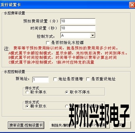 3. 水控控制設(shè)置可以更改水控機(jī)的機(jī)器號(hào)還有流水方式和停水方式;如果想更改水控機(jī)的機(jī)器號(hào)必須選擇是否重設(shè)地址;地址是否遞增,當(dāng)勾選上時(shí),機(jī)器每刷一次控制卡機(jī)器號(hào)就會(huì)增1;根據(jù)所需設(shè)置好后,點(diǎn)擊費(fèi)率設(shè)置/控制設(shè)置卡,選擇控制設(shè)置卡即可;只更改流水/停水方式時(shí),在機(jī)器上刷控制卡時(shí)顯示9 10 ok,如果更改機(jī)器號(hào),刷控制卡時(shí)顯示8 9 10 ok。