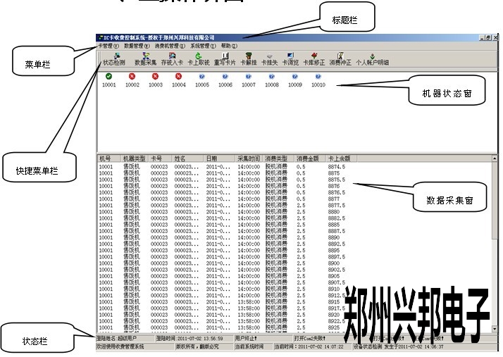 4)數(shù)據(jù)采集窗口用于查看數(shù)據(jù)的采集情況,在進(jìn)行消費(fèi)的時(shí)候,最好不要對(duì)收費(fèi)機(jī)進(jìn)行數(shù)據(jù)采集,我們不建議邊消費(fèi)邊采集數(shù)據(jù)。
