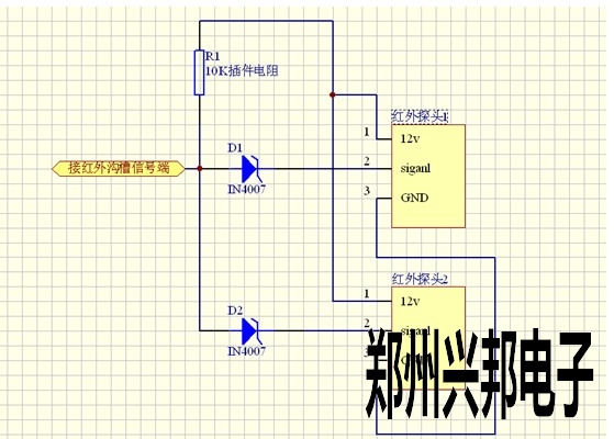 將每個二極管(IN4007)的負極和對應(yīng)的探頭信號端相連之后,再將每個二極管(IN4007)的正極擰到一起再與紅外溝槽的信號端相連。