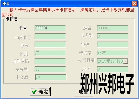 2. 此卡掛失后,然后點卡管理--補辦新卡,打開此對話框后輸入卡號后按回車鍵,當(dāng)出現(xiàn)卡信息時,把新卡放到讀卡器上點讀卡,然后點寫卡即可,如下圖所示