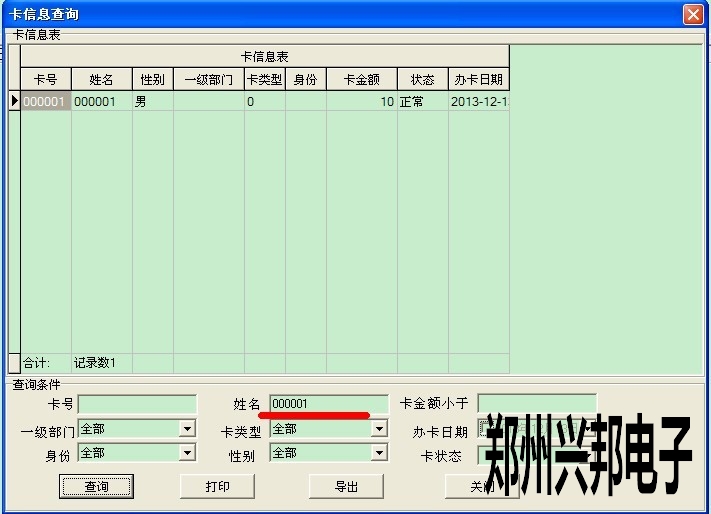 如果不知道此卡的卡號,可以從卡信息表中查看到此卡的信息,點數(shù)據(jù)管理--卡信息表,打開此表后輸入姓名,然后查詢就可以查看到此卡的卡號,然后再掛失即可,如下圖所示