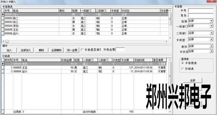 1.485軟件打開(kāi)后,點(diǎn)一下卡管理--補(bǔ)助入卡--補(bǔ)助入卡輸入,打開(kāi)補(bǔ)助入卡輸入窗口,在右卡信息中輸入想要添加的人員條件后,點(diǎn)擊下面的查詢(xún),然后在左邊的補(bǔ)助金額后面的框中填寫(xiě)補(bǔ)助金額,可以選擇是否清零,若選擇補(bǔ)助清零,在領(lǐng)取補(bǔ)助時(shí)會(huì)將卡上的金額先清零再補(bǔ)助上此次的金額;若選擇不清零,則在領(lǐng)取補(bǔ)助時(shí)會(huì)累加之前卡上的金額。點(diǎn)擊全部加入,就給選出來(lái)的人員生成補(bǔ)助.關(guān)閉此畫(huà)面,如下圖所示。