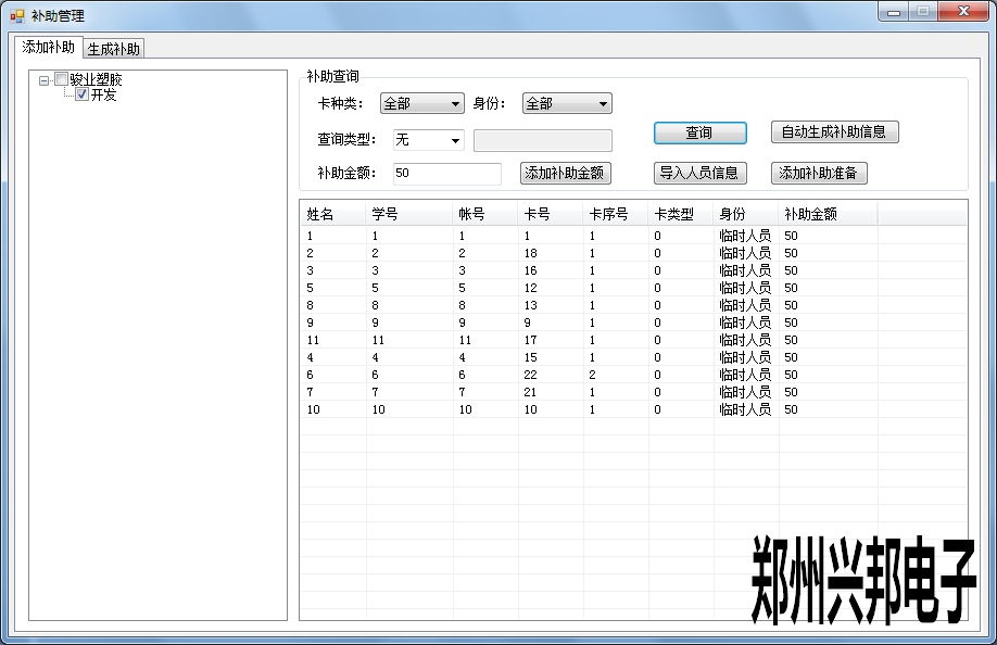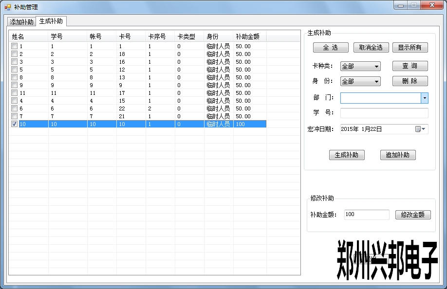 對(duì)于添加完成的補(bǔ)助,進(jìn)行生成補(bǔ)助。對(duì)添加補(bǔ)助的信息可以按照卡種類,身份,部門(mén),學(xué)號(hào)進(jìn)行查詢選擇限定條件的人員進(jìn)行補(bǔ)助,選中補(bǔ)助信息可以修改補(bǔ)助金額。選擇刪除后此補(bǔ)助計(jì)劃就沒(méi)有了。