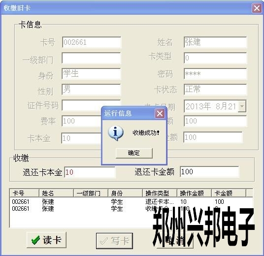 注銷(xiāo)卡就是收繳過(guò)的舊卡點(diǎn)擊【讀卡】出現(xiàn)卡片的基本信息后點(diǎn)擊【寫(xiě)卡】,提示收繳成功后點(diǎn)擊【確定】即可。對(duì)于不用的舊卡可以使用此功能進(jìn)行收繳,收繳一定要在數(shù)據(jù)采集完成之后進(jìn)行。