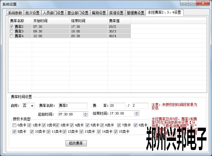 互聯(lián)網(wǎng)平臺IC卡水控機具備多費率扣費功能,不同卡類型的卡片可以按不同的費率扣費,甚至免費使用,費率最多可以設置5個費率,分別是費率1(最低消費周期,分卡類型)、費率2(時間段費率,分卡類型)、費率3(時間段費率,分卡類型)、費率4(時間段費率,分卡類型)、費率5(不分卡類型),該設置可以通過制作管理卡或者下載系統(tǒng)參數(shù)下載到水控機中。