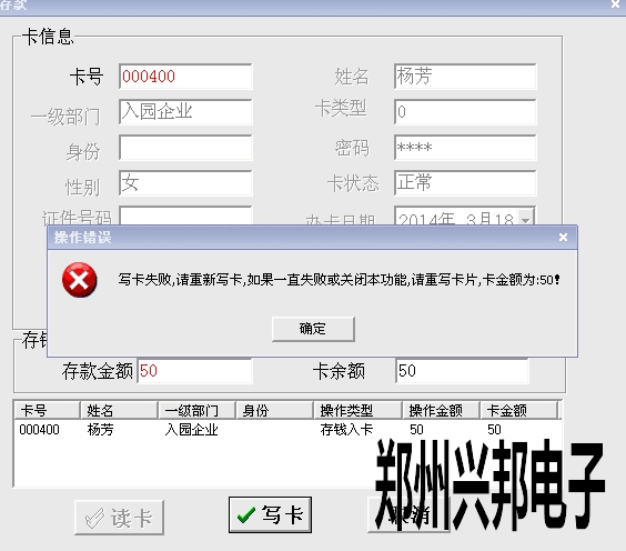 客戶在使用我們的局域網(wǎng)一卡通存款時出現(xiàn):寫卡失敗,請重新寫卡,如果一直失敗或關(guān)閉本功能,請重寫卡片,卡金額為50!