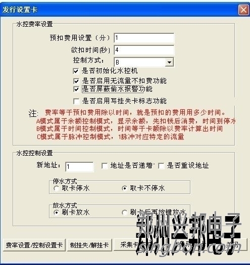 2、在水控費(fèi)率設(shè)置里面,預(yù)扣費(fèi)用設(shè)置寫(xiě)1,預(yù)扣時(shí)間寫(xiě)4,控制方式選擇B,按下圖來(lái)設(shè)。然后制一張費(fèi)率設(shè)置卡。